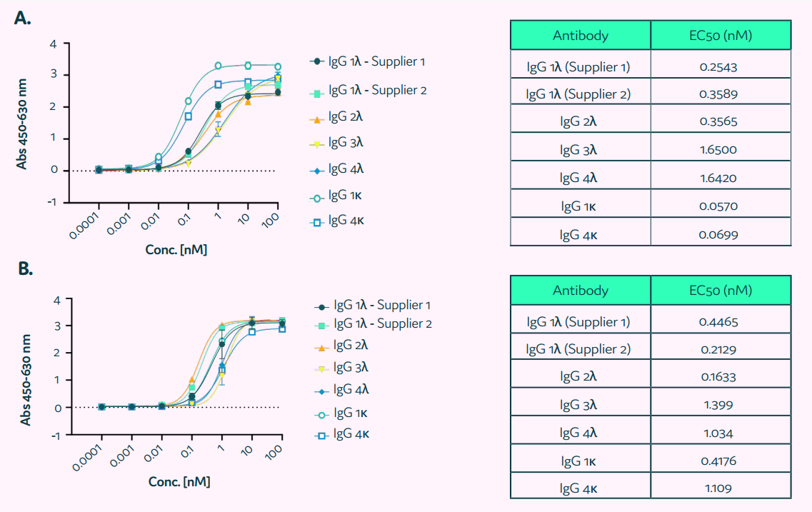 通过ELISA测定Cyto-Cellect®PLUS供体和受体探针与人IgGκ和IgGλ的结合。供体(图2A)和受体(图2B)探针均以高亲和力结合IgGκ和λ分子。IgG亚类与供体和受体的结合差异明显,与其他IgG1λ和IgG2λ相比,IgG3λ和IgG4λ与供体和受体的结合差异至少为2倍(EC50值)。