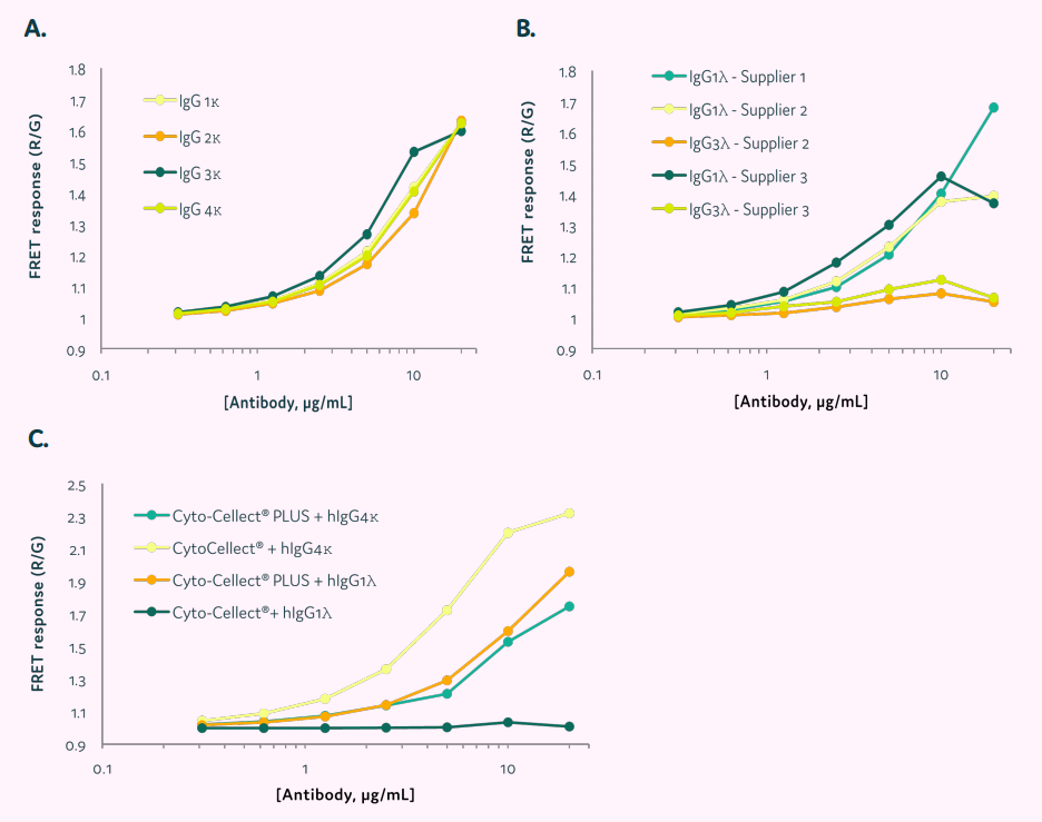 图3. 使用市售IgG或细胞培养物上清液中分泌的IgG测定Cyto-Cellect®PLUS的FRET响应。(A和B)在Cyto-Cellect®PLUS探针的存在下滴定商业来源的抗体。(C)在Cyto-Cellect®或Cyto-Cellect®PLUS探针的存在下滴定含有IgG 1λ的上清液。作为对照,滴定市售IgG 4κ,并通过两种试剂盒检测。