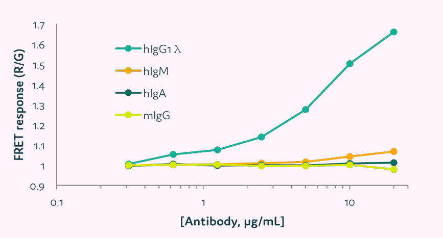 为了确定Cyto-Cellect®PLUS探针与除人IgG之外的免疫球蛋白同种型的交叉反应性,在Cyto-Cellect®PLUS探针存在下滴定商业来源的人IgM、IgA和小鼠IgG。并使用酶标仪检测FRET反应。IgG 1 λ用作对照。图5显示Cyto-Cellect® PLUS在测试浓度下与人IgA或小鼠IgG无交叉反应性。然而,在高浓度下观察到人IgM的最小检测。