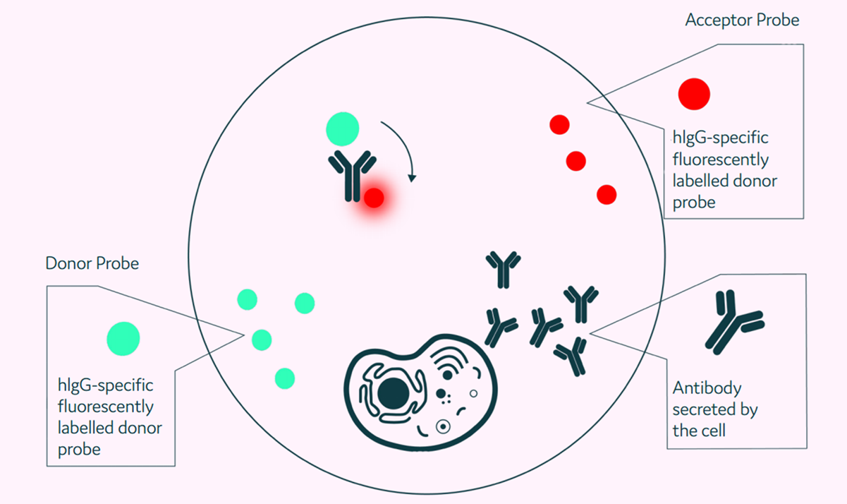 Cyto-Cellect®PLUS是适配于Cyto-Mine®的人IgG检测试剂盒,可检测皮滴包裹细胞中分泌的具有κ和λ轻链的全分子人IgG。其检测原理如图1所示:一对定制的IgG特异性AOF荧光探针被包裹在每个皮滴中。从包裹细胞中分泌的IgG被检测探针对识别,形成诱导荧光信号变化的三元FRET复合物。Cyto-Cellect®PLUS结合Cyto-Mine®可根据CHO细胞的生产率进行富集和单细胞分配。