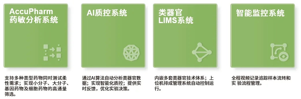 特色的AccuPharm药敏分析系统支持多种类型药物同时测试的柔性需求,可实现小分子、大分子、基因药物及细胞药物的高通量筛选。