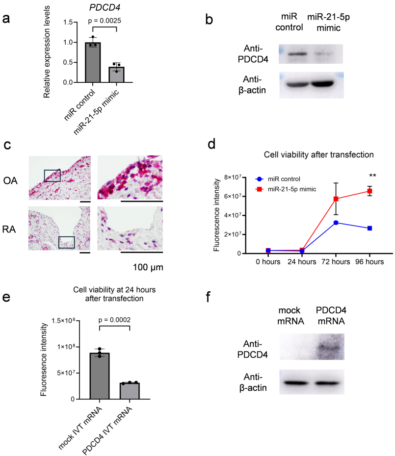 RNA-seq分析显示,miR-21-5p mimic可显著抑制PDCD4(程序性细胞死亡蛋白4)表达。免疫组化证实RA滑膜中PDCD4蛋白水平低于OA。功能实验表明,过表达PDCD4能抑制FLS增殖,而miR-21-5p通过靶向抑制PDCD4促进细胞生长。