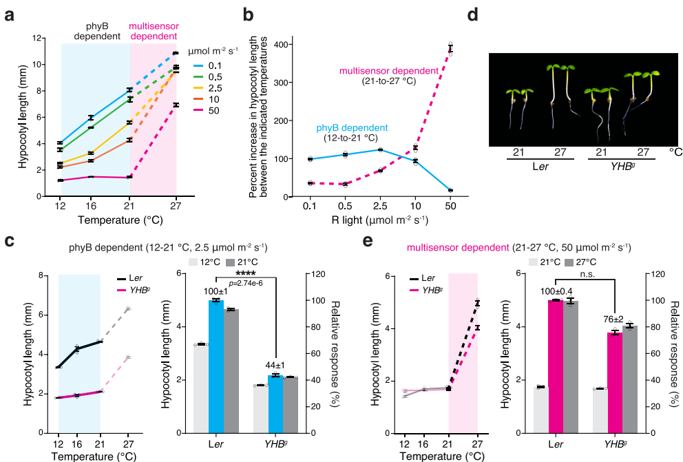 )发现温度响应存在双相特征:12-21℃为phyB依赖型(可被光抑制),21-27℃为多传感器依赖型(光不敏感)。关键发现是50μmol m-2