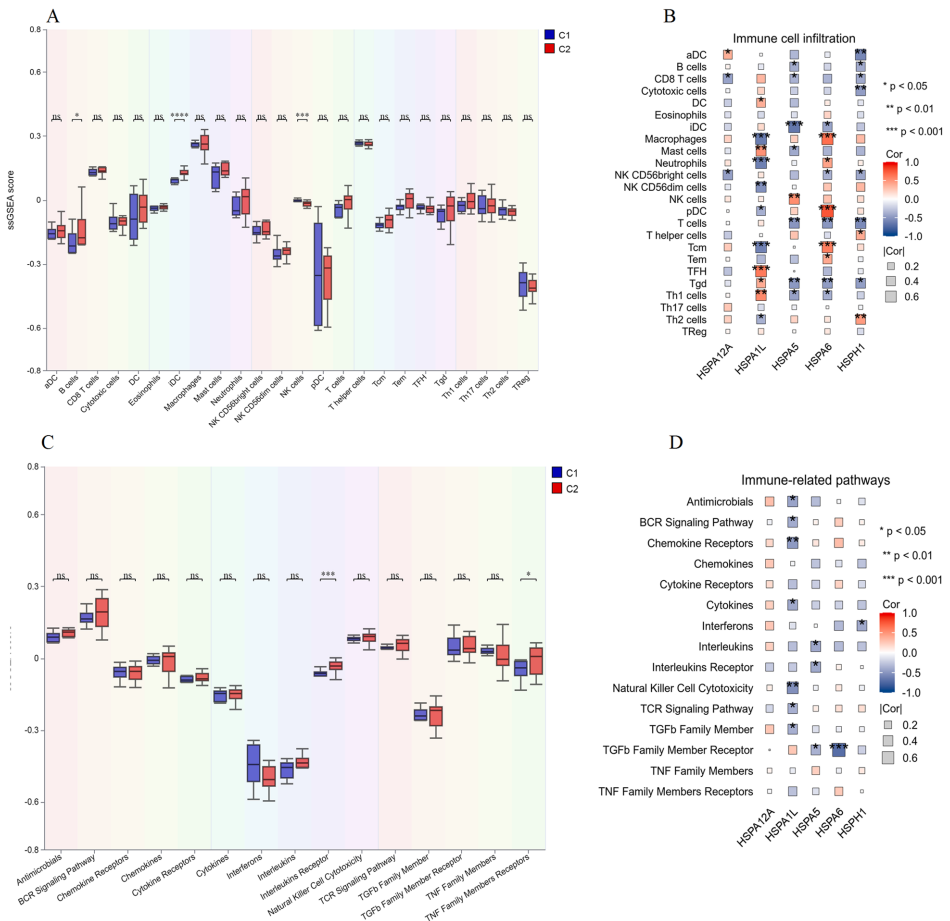 ssGSEA分析描绘出令人着迷的免疫景观:C1亚型以NK细胞浸润为特征,而C2亚型则聚集着B细胞和未成熟树突状细胞。特别值得注意的是,HSPA1L表达与肥大细胞、Th1细胞呈正相关,却与Tcm细胞呈负相关,这种"分子开关"特性使其成为潜在的免疫调节靶点。