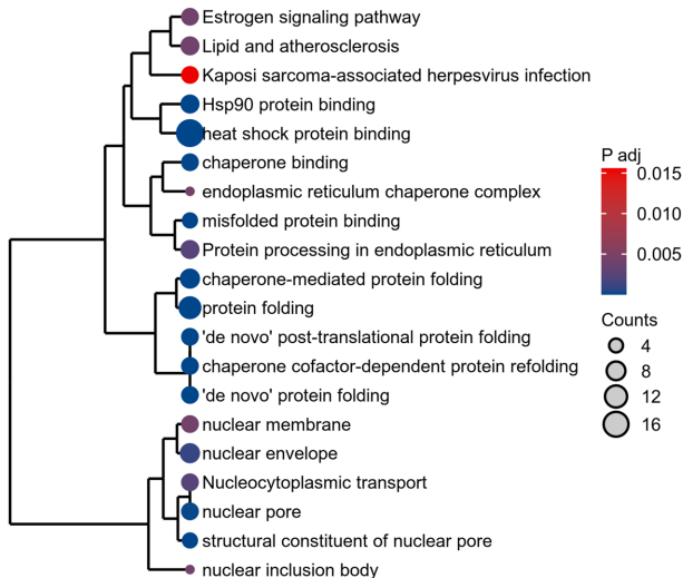 深入分析显示这些HSRs主要活跃在三个"工作场景":蛋白质折叠车间(如Hsp90蛋白结合)、内质网质量控制站(如错误折叠蛋白结合)、以及细胞核运输通道。有趣的是,它们还与卡波西肉瘤病毒感染、雌激素信号等看似不相关的通路存在交集,暗示HSPs可能是连接OA与其他疾病的"分子桥梁"。