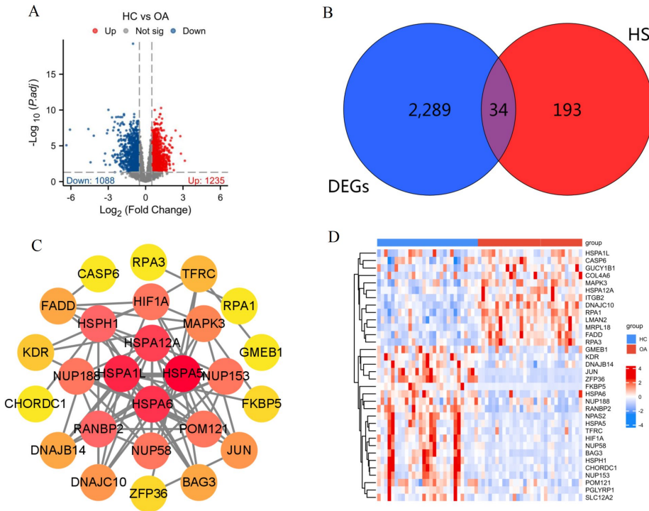 研究首先绘制出OA与健康对照的基因表达"地形图",发现2323个差异基因中,34个属于HSRs家族。这些基因在蛋白互作网络中形成以HSPA5、HSPA6、HSPA1L为核心的"指挥中心",如同交响乐团的领奏者协调着OA的分子乐章。特别值得注意的是,HSPA1L和HSPA12A在OA中显著高调"演唱",而HSPA5、HSPA6和HSPH1则异常"沉默"。
