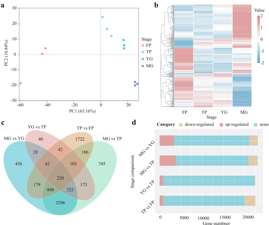 转录组分析发现成熟配子体与丝状原丝体阶段存在5,943个差异基因,是最显著的发育转折点。主成分分析显示叶状原丝体与幼配子体的基因表达谱较为接近,暗示这是渐进式的发育过渡。