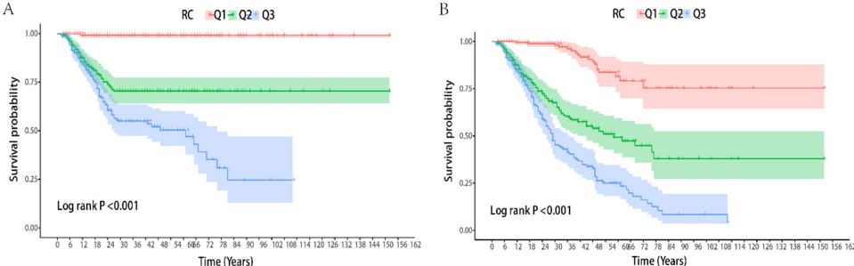 RC三分位分组显示,高RC组(Q3: >0.31 mmol/L)同时存在最严重的肝损伤(ALT 853 U/L vs Q1 535 U/L)和最低的28天生存率(39.59% vs Q1 91.41%)。值得注意的是,Q3组70%合并低蛋白血症,暗示RC可能通过影响蛋白质合成途径加剧病情。