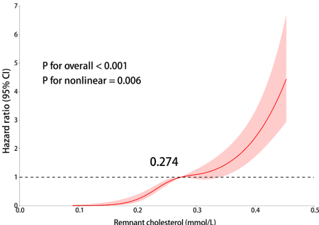 在完全校正模型(Model 4)中,Q3组死亡/肝移植风险达Q1组的11.02倍(95%CI:6.20-19.60)。RCS分析揭示非线性剂量效应关系——当RC>0.3 mmol/L时,死亡风险曲线呈陡峭上升趋势。