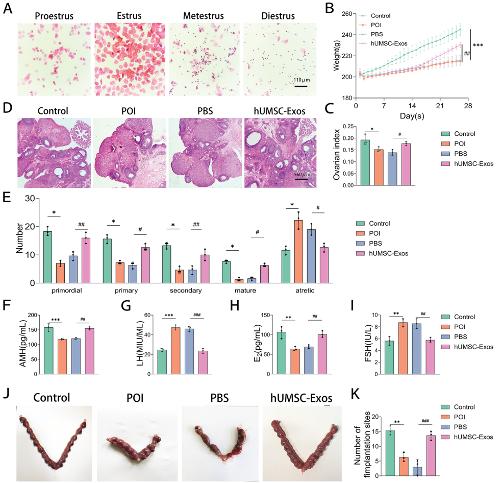 hUMSC-Exos治疗显著增加POI大鼠体重和卵巢湿重,H&E染色显示功能卵泡数量恢复,ELISA检测血清E2