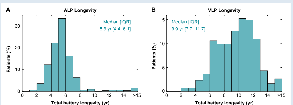 为解决传统双腔起搏器导线相关并发症问题,国际多中心团队通过AVEIR DR i2i研究评估首款双腔无导线起搏器(ALP/VLP)的电池寿命。结果显示ALP/VLP中位寿命达5.3/9.9年,i2i通信强度、基础频率等参数显著影响 longevity(P<0.001)。该研究为优化无导线设备编程提供循证依据,推动心脏节律管理技术革新。