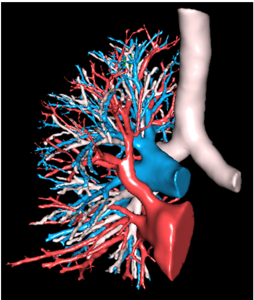 研究团队采用三项关键技术:1)基于Visible Patient实验室的CT三维重建技术,提取标准肺段支气管(白色)-动脉(蓝色)-静脉(红色)模型;2)采用Tiertime UP300打印机和Polymaker TPU材料进行柔性打印,通过MeshMixer软件优化模型;3)设计包含2D图谱、CT断层和手术视频的多模态评估体系。样本来自2例标准肺段切除术患者的影像数据。