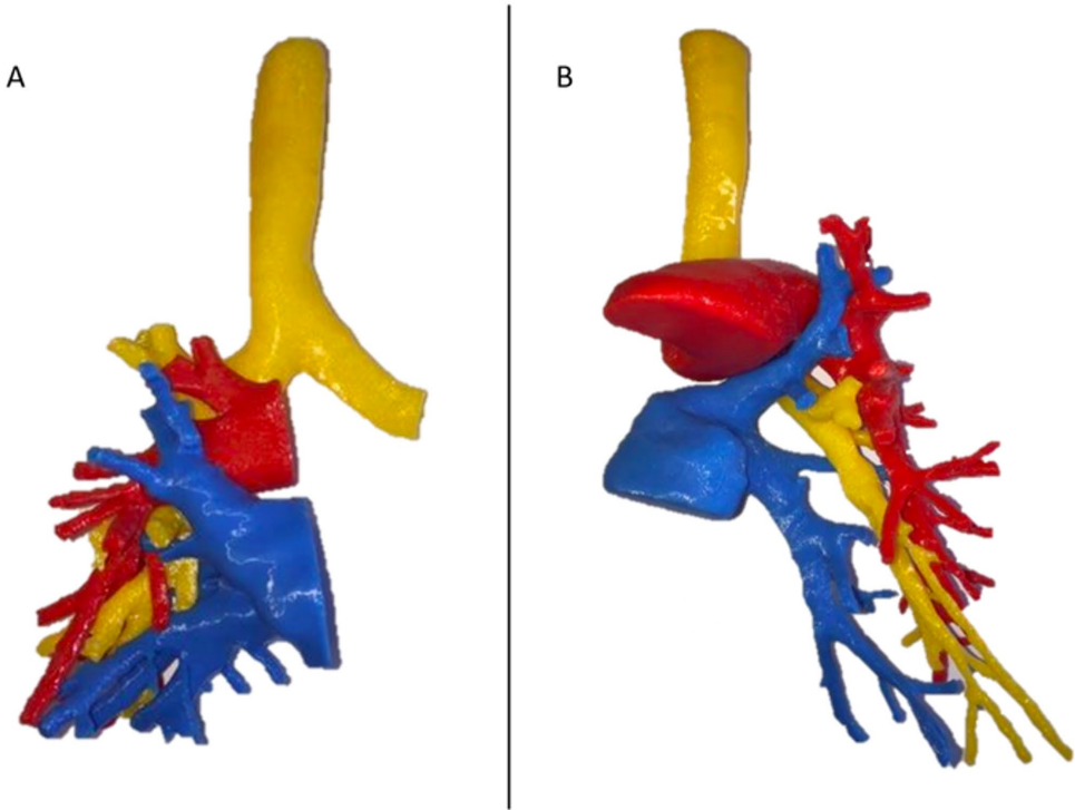 针对这一教育困境,法国里昂路易普拉德尔医院胸外科团队联合CO'Lab 3D平台开展了一项创新研究。研究者将16名医学生随机分为三组:传统组(2D图谱+PPT)、3D可视化组(Visible Patient软件)和3D打印组(TPU材料模型),通过pre-test/post-test对比评估教学效果。令人振奋的是,使用柔性TPU材料打印的支气管(黄色)-动脉(红色)-静脉(蓝色)嵌套模型,其教学效果(Δscore=+6.7,p=0.0003)媲美传统教学(Δscore=+9.5),且学生满意度达8/10。这项发表于《3D Printing in Medicine》的研究,为解剖学教育数字化转型提供了重要范本。