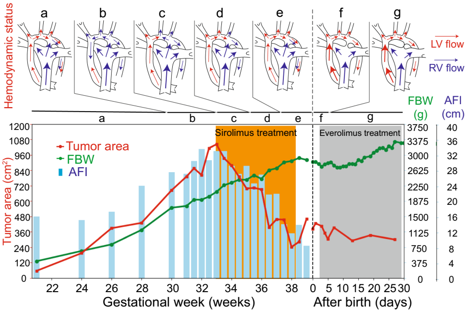 爱知儿童健康医疗中心的研究团队报道了一例突破性治疗:孕32周胎儿因左心室(LV)巨大横纹肌瘤(直径>40 mm)导致严重心力衰竭(心血管评分CVPS=7),伴随颅内室管膜下巨细胞星形细胞瘤(SEGA)。通过母体口服西罗莫司(血药浓度5-12 ng/mL),肿瘤6周内缩小35%,LV功能改善(CVPS升至9),胎儿顺利足月分娩。值得注意的是,颅内SEGA也从7.9 mm缩小至6.1 mm,且母婴均未出现严重副作用。基因检测最终证实TSC2突变(c.220G>T),患儿3月龄时神经发育正常。