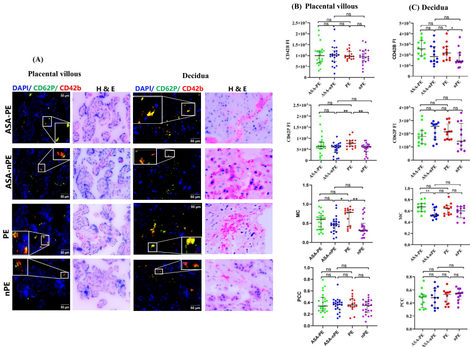 研究纳入香港威尔士亲王医院2020-2023年分娩的993名孕妇队列,分为阿司匹林治疗PE组(ASA-PE)、阿司匹林治疗非PE组(ASA-nPE)和未用药对照组(ASA-naive nPE)。采用线性混合模型分析妊娠早中晚期PC/MPV动态变化;通过Opal多重免疫荧光技术检测胎盘绒毛/蜕膜组织CD42b(血小板标记)与CD62P(活化标记)共定位;利用DNBSEQ平台进行血小板RNA-seq,结合KEGG/GSEA分析差异表达基因;通过RT-qPCR验证FKBP5、FZD5等关键基因。