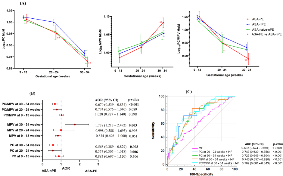 通过随机截距-斜率模型发现,ASA-PE组在妊娠20-24周时PC显著低于ASA-nPE组(调整p=0.003),至30-34周时PC/MPV比值降低而MPV升高(p<0.01)。