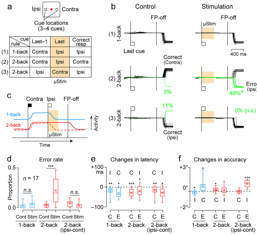 电刺激实验获得决定性证据:在2-back任务中对PFC外侧部施加刺激,选择性地消除对侧空间记忆(错误率增加p=2.21×10-4