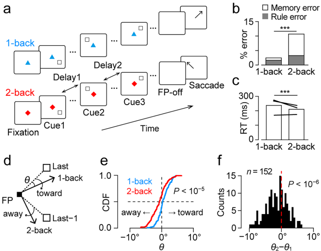 通过设计1-back和2-back两种记忆负荷条件,研究人员发现猕猴在2-back任务中错误率显著更高(77-89% vs 88-97%),且反应时更短(194±29ms vs 208±51ms),表明认知负荷差异。有趣的是,2-back条件下的眼跳轨迹会主动偏离最新记忆位置,暗示神经系统存在主动抑制机制。