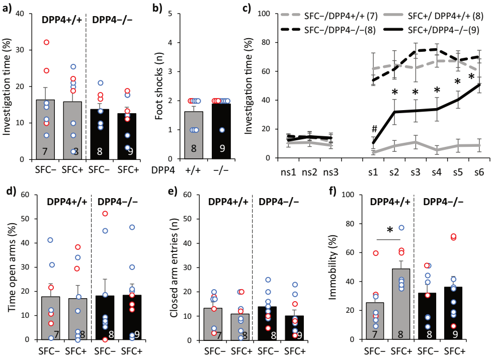 小鼠表现出与药物处理组相似的表型:恐惧消退加速(从第2个社交刺激开始恢复),且不发展出FST不动性增加。这一遗传学证据强化了DPP4作为治疗靶点的可靠性。
