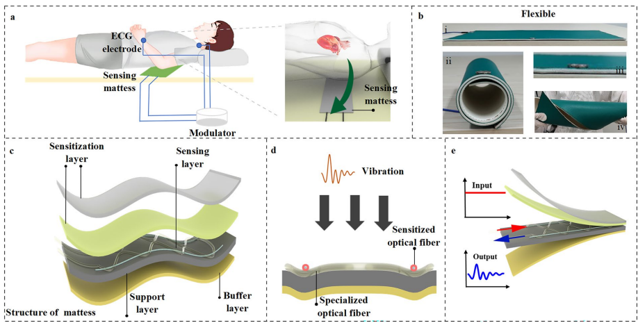 研究团队设计的柔性光纤传感系统(图1)包含敏感层、传感层和支持层,通过光学信号调制捕捉心跳微振动。