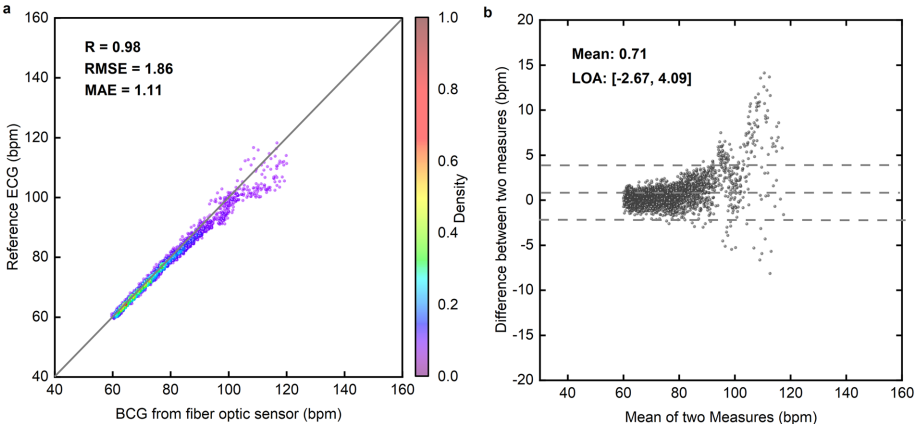 Bland-Altman分析显示BCG与ECG心率检测偏差仅0.71bpm(图5),证实技术可靠性。