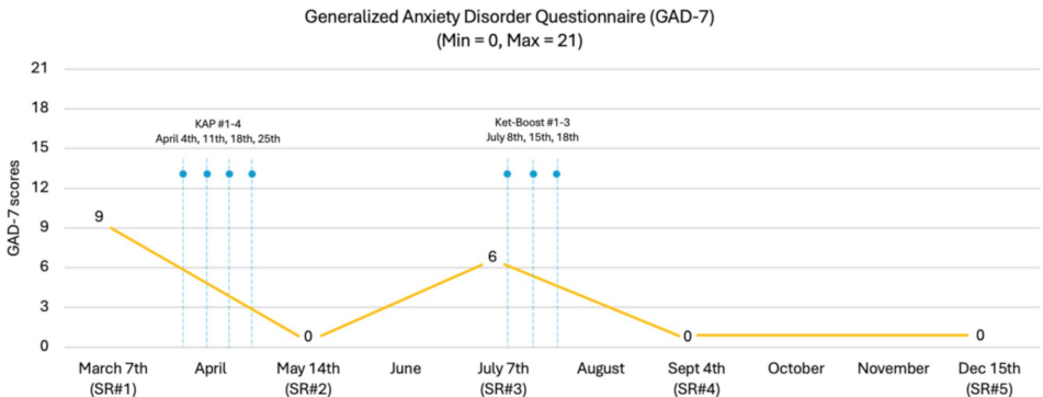 研究采用单病例追踪设计,对一名BMI 17.6的晚期AN女性患者进行4次KAP疗程和3次氯胺酮加强治疗,通过EDE-Q、PHQ-9等量表评估5个月疗效。关键技术包括:1)基于ICD-10诊断标准的患者筛选;2)肌注氯胺酮(0.5-0.75 mg/kg)联合ACT心理治疗;3)多时间点(基线、治疗后、加强期、随访)的标准化评估体系;4)KSET副作用监测工具。