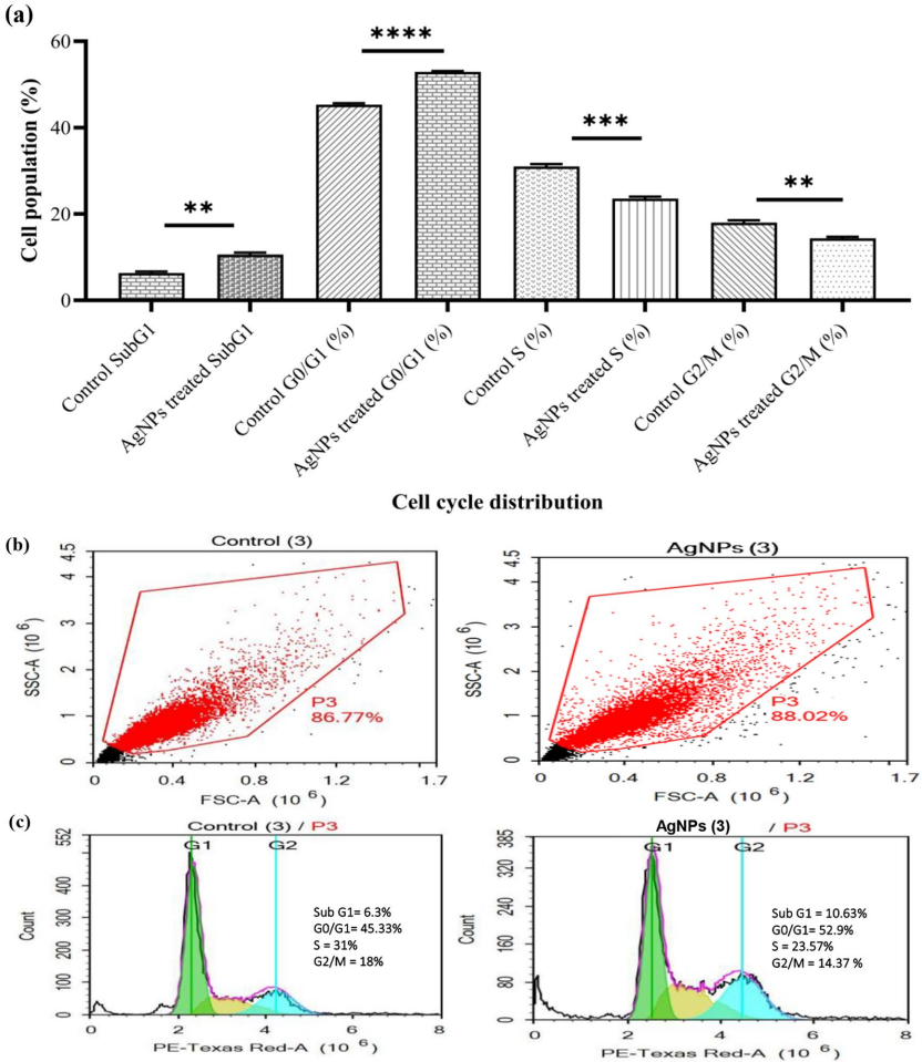 研究通过18S rRNA测序鉴定真菌菌株,采用紫外-可见光谱(UV-vis)监测AgNPs合成(特征吸收峰420 nm),透射电镜(TEM)分析形貌(5-25 nm球形颗粒),动态光散射(DLS)检测稳定性(PDI=0.074),傅里叶变换红外光谱(FT-IR)鉴定包覆蛋白功能基团。抗菌实验采用肉汤稀释法测定最小抑菌浓度(MIC),抗癌机制通过流式细胞术分析细胞周期和划痕实验评估迁移抑制。