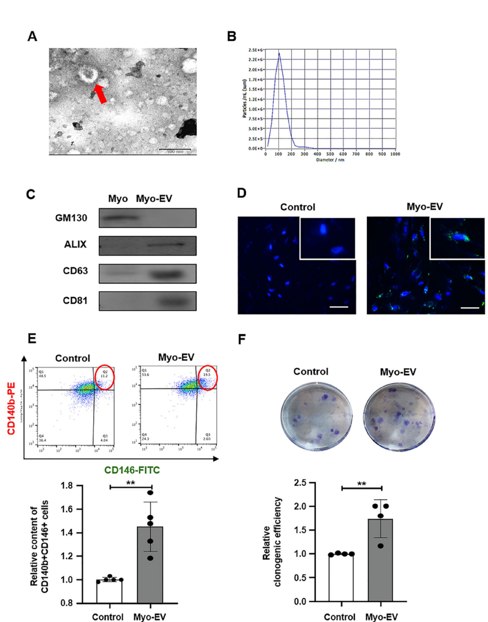 比例下降40%(P<0.05),克隆形成减少50%(P<0.01)。EV耗竭的子宫肌层条件培养基(Myo-DCM)使eMSC克隆形成率降低35%(图1D),证实EV是肌层细胞调控eMSC的关键介质。