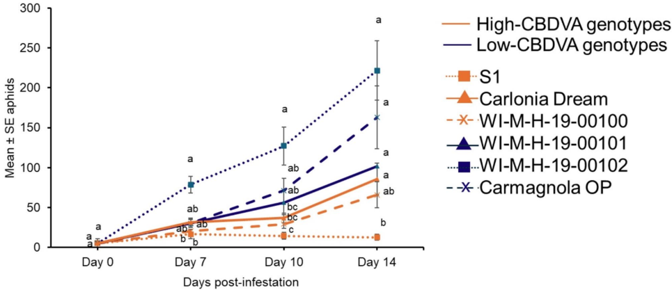 【大麻蚜虫种群在高CBDVA基因型上显著受抑】