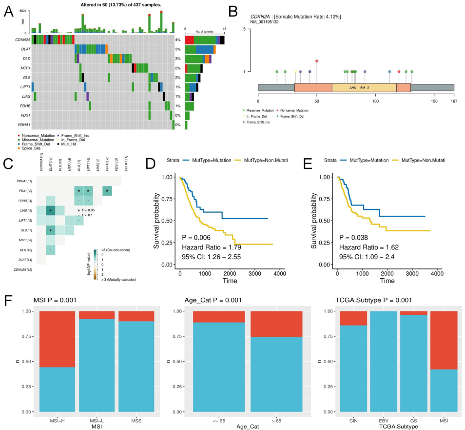 CDKN2A是突变频率最高的基因(18例),其结构域突变与不良预后显著相关。PDHB拷贝数增加提示更好生存率(p<0.05),且与微卫星不稳定性(MSI)呈正相关。