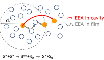 在R6G分子体系中也观察到类似现象:强耦合腔(Rabi分裂325 meV)EEA阈值显著低于薄膜;弱耦合腔仍保持增强效应。通过调控腔厚度发现,更大的单分子耦合强度g0