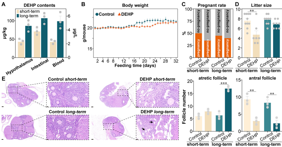 DEHP在肠道、血液和下丘脑显著蓄积,导致卵巢颗粒细胞层松散、闭锁卵泡增加,妊娠率下降38.2%(短周期)和52.1%(长周期)。