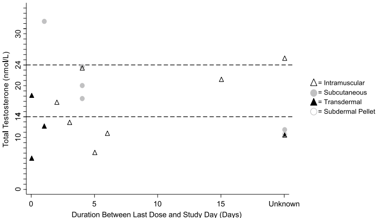 队列中位年龄28岁,94%为白人,GATT使用中位时间48个月。注射途径占72%(肌肉/皮下),总睾酮中位数17 nmol/L(6-33 nmol/L),52%超出临床推荐范围。