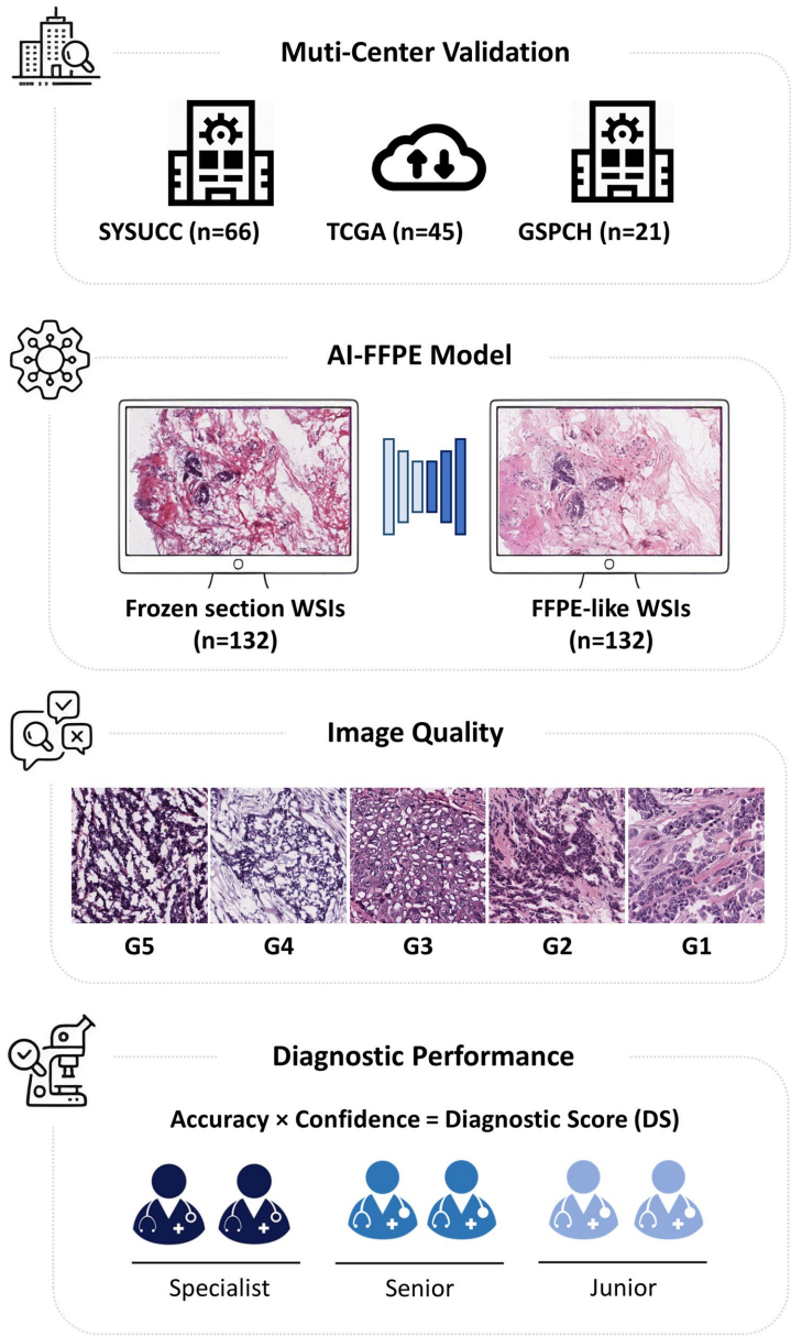 本研究针对乳腺病变术中冰冻切片(FS)存在组织伪影、诊断准确性受限的临床难题,开发了基于注意力机制生成对抗网络(GAN)的AI-FFPE模型,成功将FS图像转化为福尔马林固定石蜡包埋(FFPE)样图像。多中心多阅片者研究证实,该技术显著提升图像质量(p<0.001)和诊断信心(p<0.001),为术中快速病理决策提供新工具。