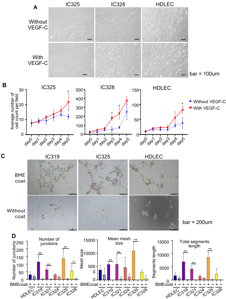 研究团队创新性地选择手术中常规废弃的腋窝脂肪组织作为细胞来源,通过优化组织消化和分选流程,成功从17例患者样本中分离出功能性LECs。这些被命名为AA-LEC(腋窝脂肪组织来源LEC)的细胞在VEGF-C刺激下表现出显著增殖增强(IC325细胞第5天增殖1.81倍,p<0.05),并在基底膜提取物(BME)上形成典型管腔结构,证实其具备LECs的关键生物学特性。