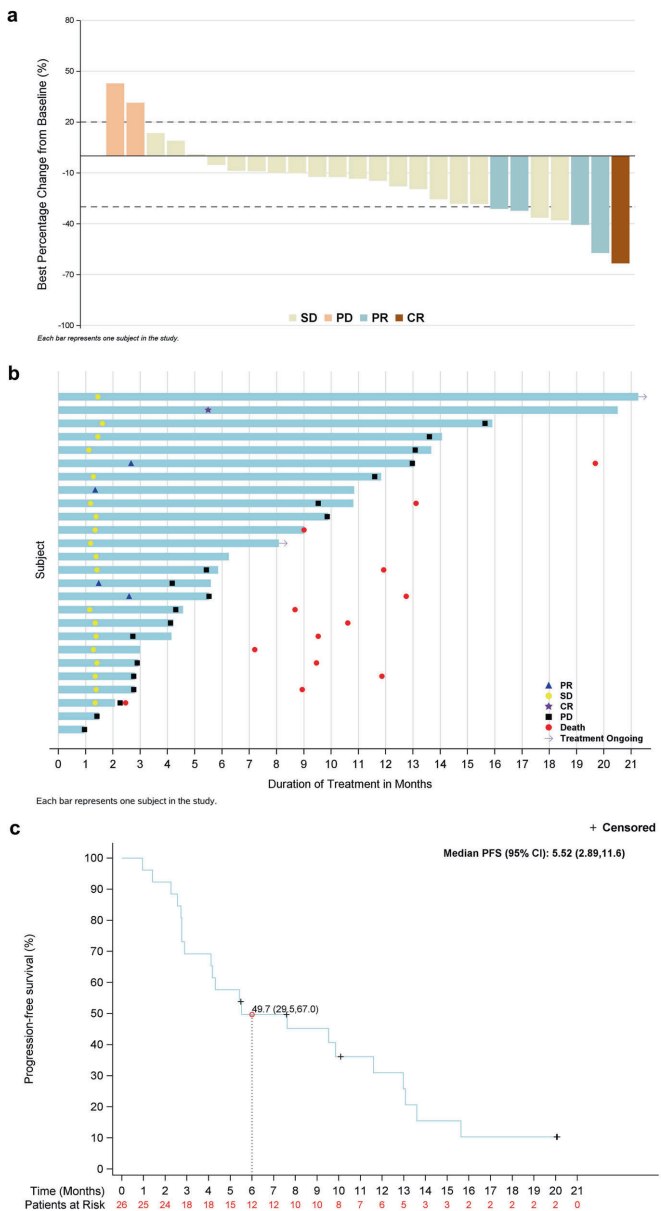 单药组ORR 19.2%(5/26,含1例CR),DCR 92.3%,中位PFS 5.5个月,OS 13.1个月。联合组ORR提升至45.2%(19/42),DCR 92.9%,中位PFS达7.5个月,OS未达到。亚组分析显示无论既往治疗线数、肿瘤部位,联合方案均显示优势。