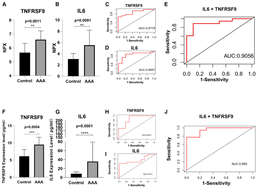 山西医科大学第二医院的研究团队在《iScience》发表的最新研究中,采用Olink邻近延伸检测(Proximity Extension Assay, PEA)技术对28例临床样本(18例AAA患者vs 10例健康人)进行92种炎症相关蛋白筛查,结合GSE183464转录组数据和动物实验,首次将肿瘤坏死因子受体超家族成员9(TNFRSF9)鉴定为AAA的新型诊断标志物。研究发现TNFRSF9与经典炎症因子IL-6的组合诊断模型曲线下面积(AUC)高达0.95,并通过单细胞测序揭示TNFRSF9主要富集于AAA组织中的T细胞,为理解AAA的免疫调控机制开辟了新视角。