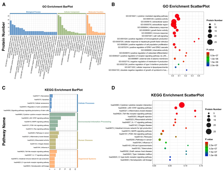 研究团队通过高灵敏度的Olink炎症面板检测,在AAA患者中发现38个差异表达蛋白(DEPs),其中26个上调(如IL-6、CXCL10)、12个下调。GO分析显示这些蛋白显著富集于细胞因子-细胞因子受体相互作用通路和JAK-STAT信号通路。
