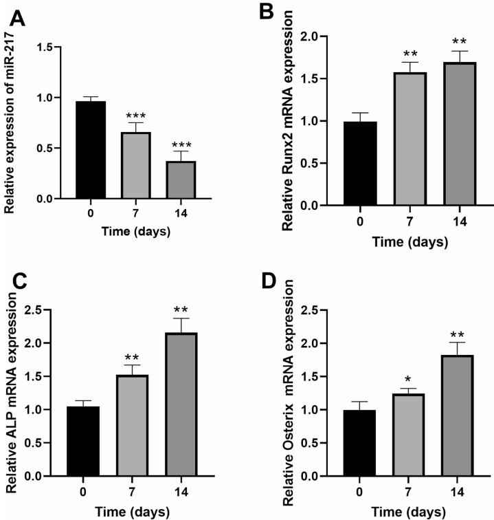 RT-qPCR显示,随着MC3T3-E1细胞成骨分化,miR-217表达呈时间依赖性下降(***