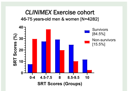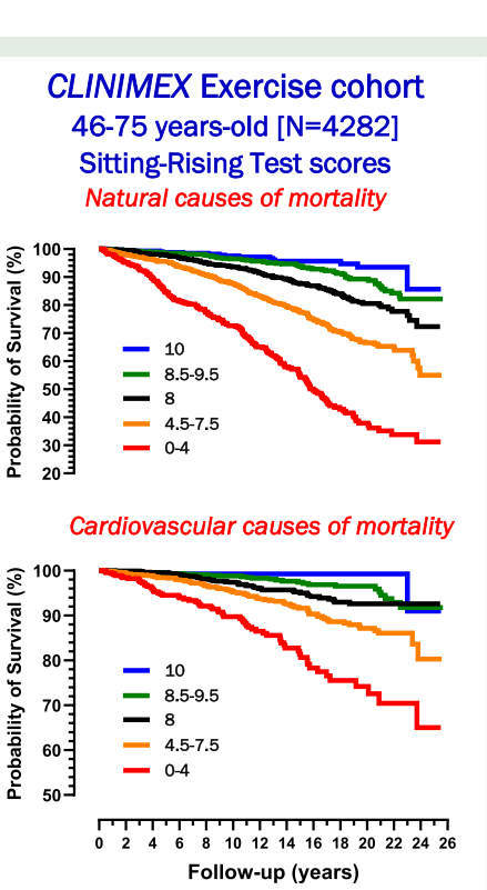 这项发表在《European Journal of Preventive Cardiology》的研究,基于CLINIMEX运动队列4282名46-75岁参与者(男性68%)的12.3年随访数据,首次证实SRT评分能特异性预测自然和心血管死亡风险。研究采用前瞻性队列设计,通过标准化SRT协议评估参与者从地板坐起的能力,按支持部位使用情况(手/膝)和动作稳定性进行0-10分评分。主要终点为排除COVID-19和外部原因后的自然死亡,次要终点为心血管特异性死亡。