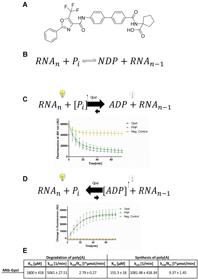 研究证实重组表达的Mtb-GpsI具有典型PNPase功能,通过硫黄素T(ThT)荧光法检测到其既能催化poly(A)链的3'→5'降解(Km=0.62μM),也能进行poly(A)合成(Km=0.91μM)。尺寸排阻色谱显示天然GpsI形成约300kDa的三聚体,与已知PNPase结构特征相符。