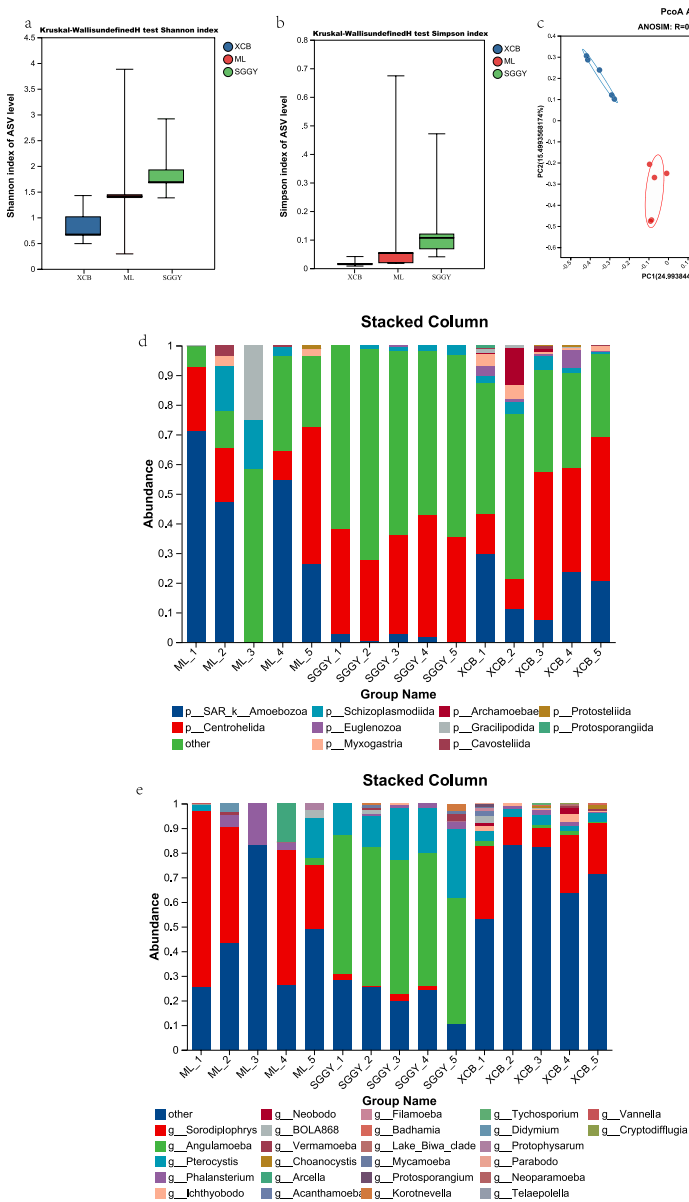 在10个原生生物门中,中心粒虫门(Centrohelida)在SGGY和XCB占优(28.35%±15.01%),而SAR_k__Amoebozoa在ML达39.96%±24.67%。LEfSe分析揭示SGGY特异的角变形虫(Angulamoeba)与XCB富集的新波豆虫(Neobodo)形成鲜明对比,后者是水质清洁的指示生物。