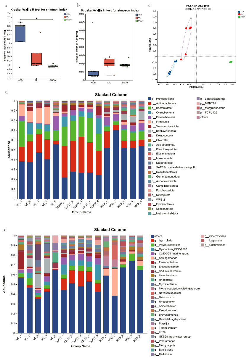 为揭示这一科学问题,昭通学院的研究团队在《Annals of Microbiology》发表了一项开创性研究。他们选取昭通地区三类典型水体:农业主导的毛林湖(ML)、高干扰城市公园湖(SGGY)和无人干扰的小草坝自然保护区湖(XCB),通过0.22-μm滤膜过滤采集水样,运用Illumina PE300平台进行16S rRNA(细菌)和18S rRNA(真核生物)V3-V4区高通量测序,结合DADA2算法生成ASV(扩增子序列变体),采用LEfSe分析、PCoA排序等生物信息学方法,系统解析了不同干扰强度下微生物群落的响应规律。