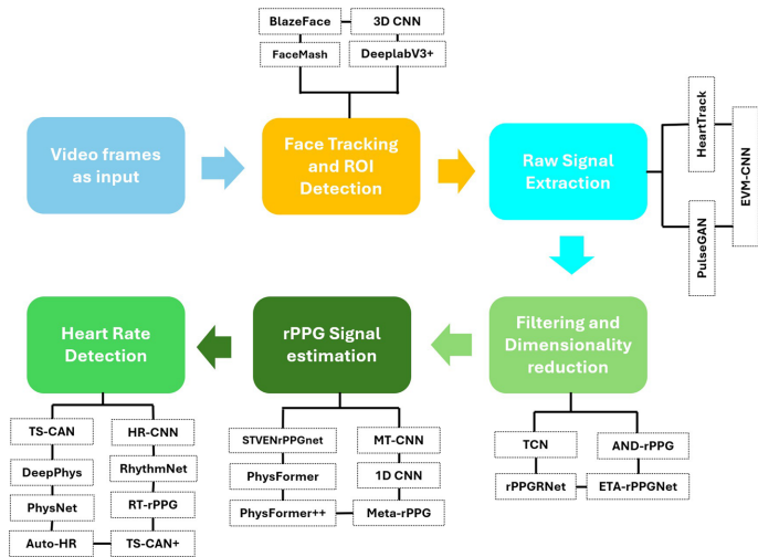 这篇综述系统梳理了利用远程光电容积描记术(rPPG)结合深度学习技术进行非接触式心率(HR)监测的研究进展。文章对比了传统信号处理方法(如ICA、PCA)与新型神经网络架构(如CNN、Transformer)的性能差异,指出深度学习在克服运动伪影和光照干扰方面的优势。通过分析145篇文献,作者总结了现有数据集特征(如MAHNOB-HCI、PURE)、关键技术挑战(如ROI检测、BSS分离)及临床应用场景(如远程医疗、新生儿监护),为未来实时监测系统的开发提供了重要参考。