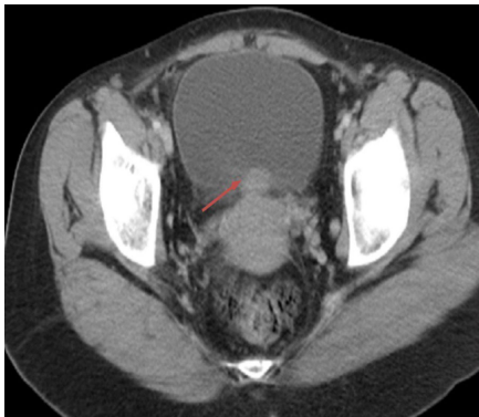 Differential diagnosis, investigations, and treatment部分展现了临床思维过程。影像学检查的价值在此得到充分体现:CT清晰显示了膀胱后壁3cm占位及其与子宫的解剖关系