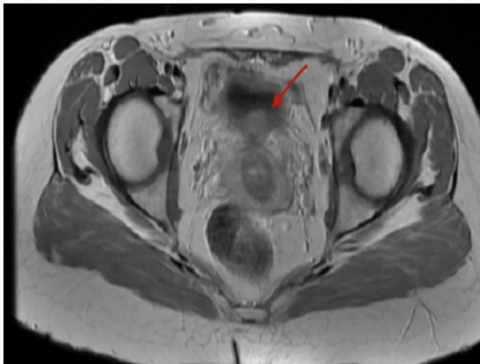 研究团队采用了循序渐进的诊断策略:首先通过实验室检查排除常见泌尿系统疾病,发现患者存在明显血尿(显微镜下满视野红细胞)和国际标准化比值(INR)2.5的凝血异常。影像学检查成为关键突破口,超声(US)初步发现膀胱后壁占位,计算机断层扫描(CT)精确定位到一个3cm的肿块,磁共振成像(MRI)则进一步显示病灶在T2加权像上的特征性低信号表现。尽管膀胱镜(Cystopanendoscopy, CPE)和诊断性腹腔镜可能提供更多信息,但基于影像学的高度特异性表现,团队决定直接进行手术治疗。