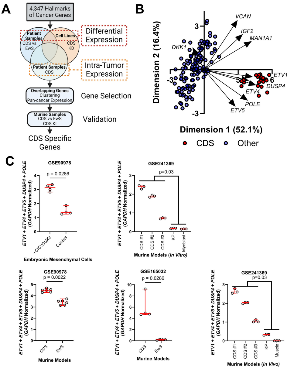 研究人员创新性地交叉比对了患者肿瘤、CIC::DUX4敲除细胞系和异种移植模型数据,最终提炼出POLE、ETV1/4/5和DUSP4组成的诊断标志物组合。其中POLE的表达水平与增殖标志物MKI67呈现强相关性(r2=0.83),在15,353例泛癌分析中展现出CDS特异性。这一发现首次将DNA复制核心元件与CDS的生物学特性联系起来。