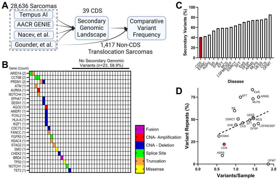 在儿童和青少年高发的恶性软组织肿瘤中,CIC::DUX4易位阳性肉瘤(CDS)因其侵袭性强、化疗反应差而备受关注。这类被归类为"小圆蓝细胞肿瘤"的罕见肉瘤,五年生存率显著低于其他同类肿瘤。尽管CIC::DUX4融合基因已被确认为其分子标志,但驱动其恶性表型的下游机制始终成谜,导致临床缺乏针对性治疗策略。传统化疗方案对CDS效果有限,患者常面临"无药可用"的困境,这促使科学家们必须深入解析其分子特征以寻找新的治疗靶点。