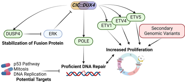 这项研究重塑了人们对CDS分子机制的认识:CIC::DUX4融合通过同时激活ETV转录因子(驱动增殖)和POLE-DNA修复轴(维持稳定),创造出独特的致癌环境。这种"高速复制-精密修复"的恶性循环,恰是临床治疗需要突破的关键环节。