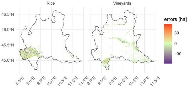 通过省级统计验证显示,82.3%的作物面积(如小麦、玉米)拟合优度R2>0.75且误差<20%。区域尺度验证中,伦巴第水稻田(图3)与艾米利亚-罗马涅蔬菜地(图4)的空间匹配度较高,但葡萄园存在系统性高估。